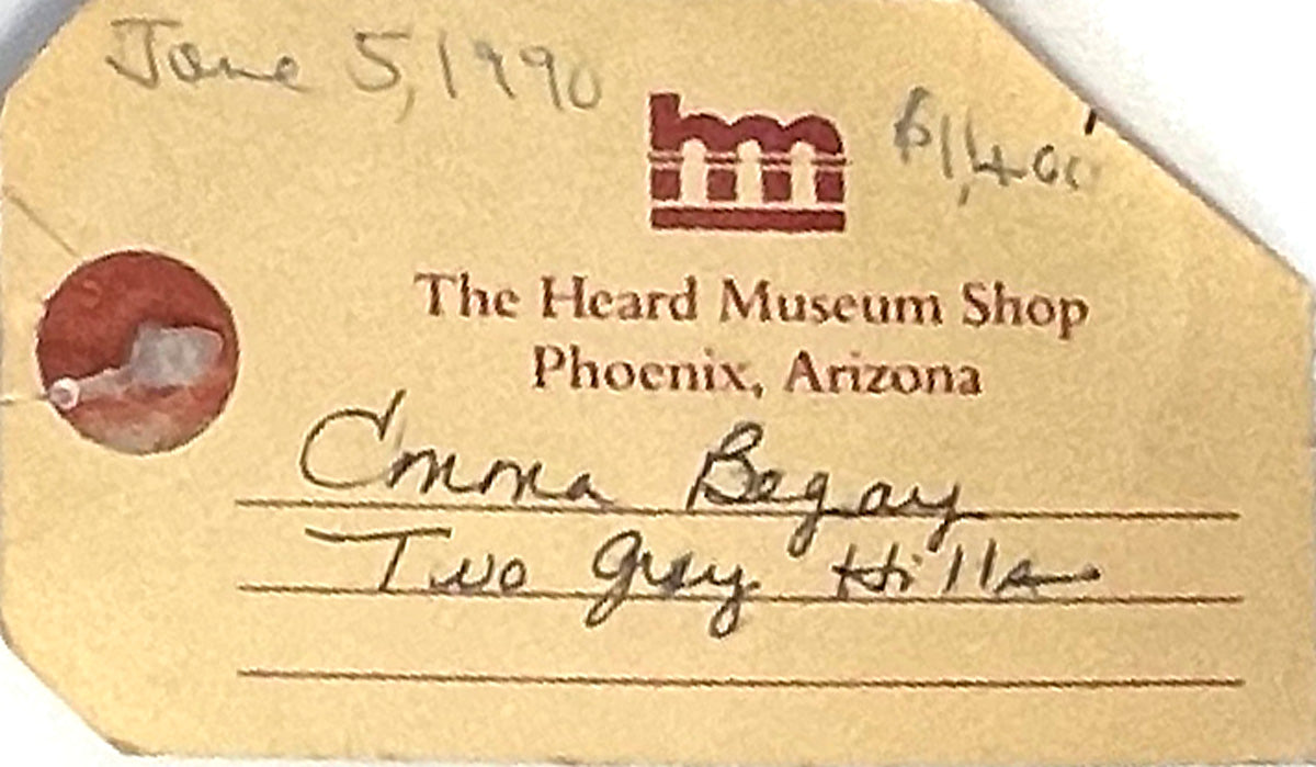 This weaving has some slight fuzziness to the wool. The selvage, corners, and tassels are nicely intact, with slight weft wear along the edges. The warp count is 11, and the weft count is 32, per inch. Ex Arizona collection. Includes an old tag from the Heard Museum Shop with the artist's name.
