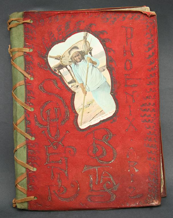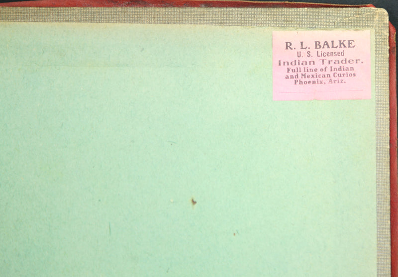 Hardcover, leather over board covers with leather binding strip. Contains 64 postcards. R.L. BALKE U.S. Indian Trader. Full line of Indian and Mexican Curious, Phoenix AZ. Written inside is "Josias Friedli, Florence, Arizona 1905. He was a missionary to the Pima Indians - sponored by The Presbyterian Church."