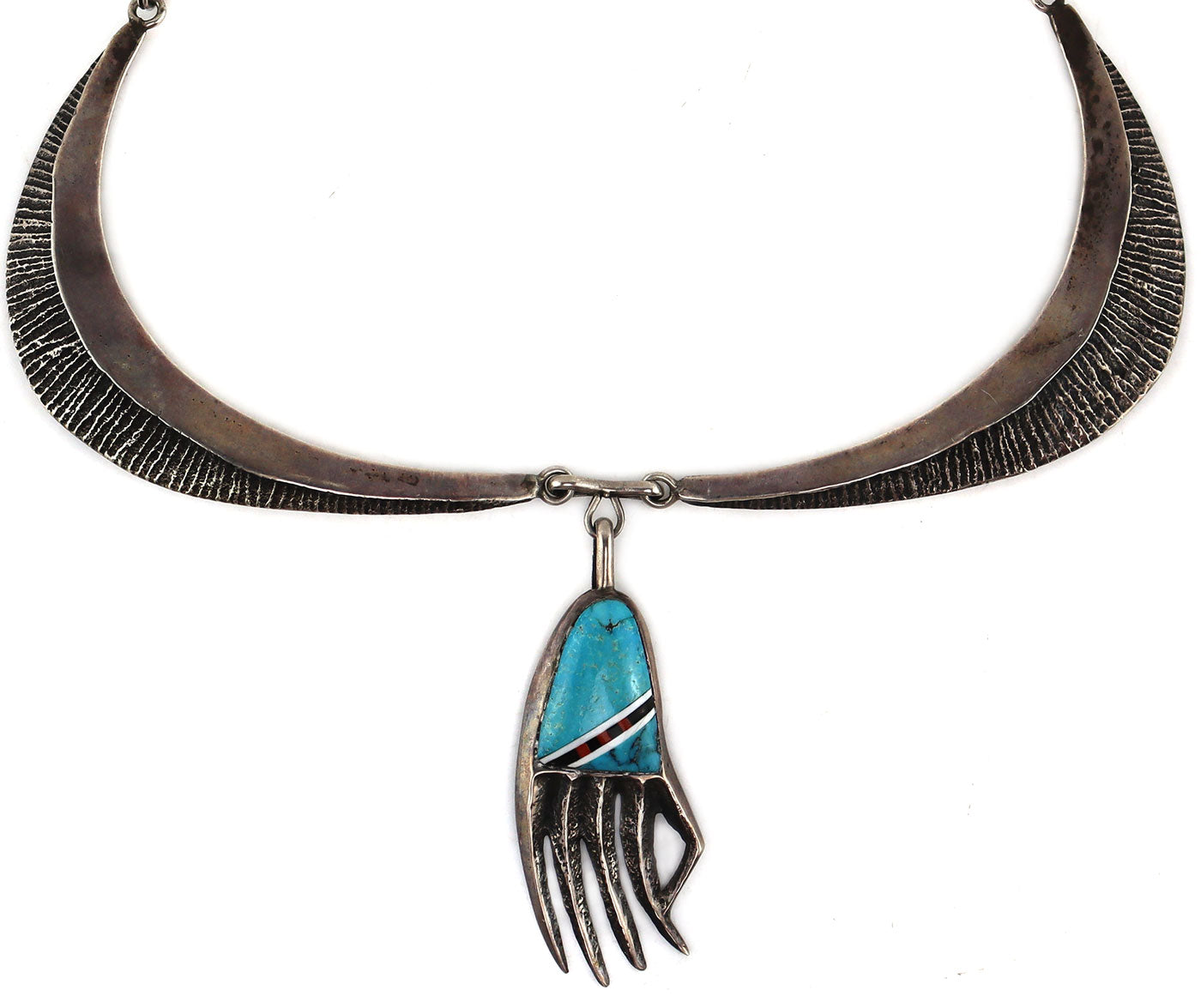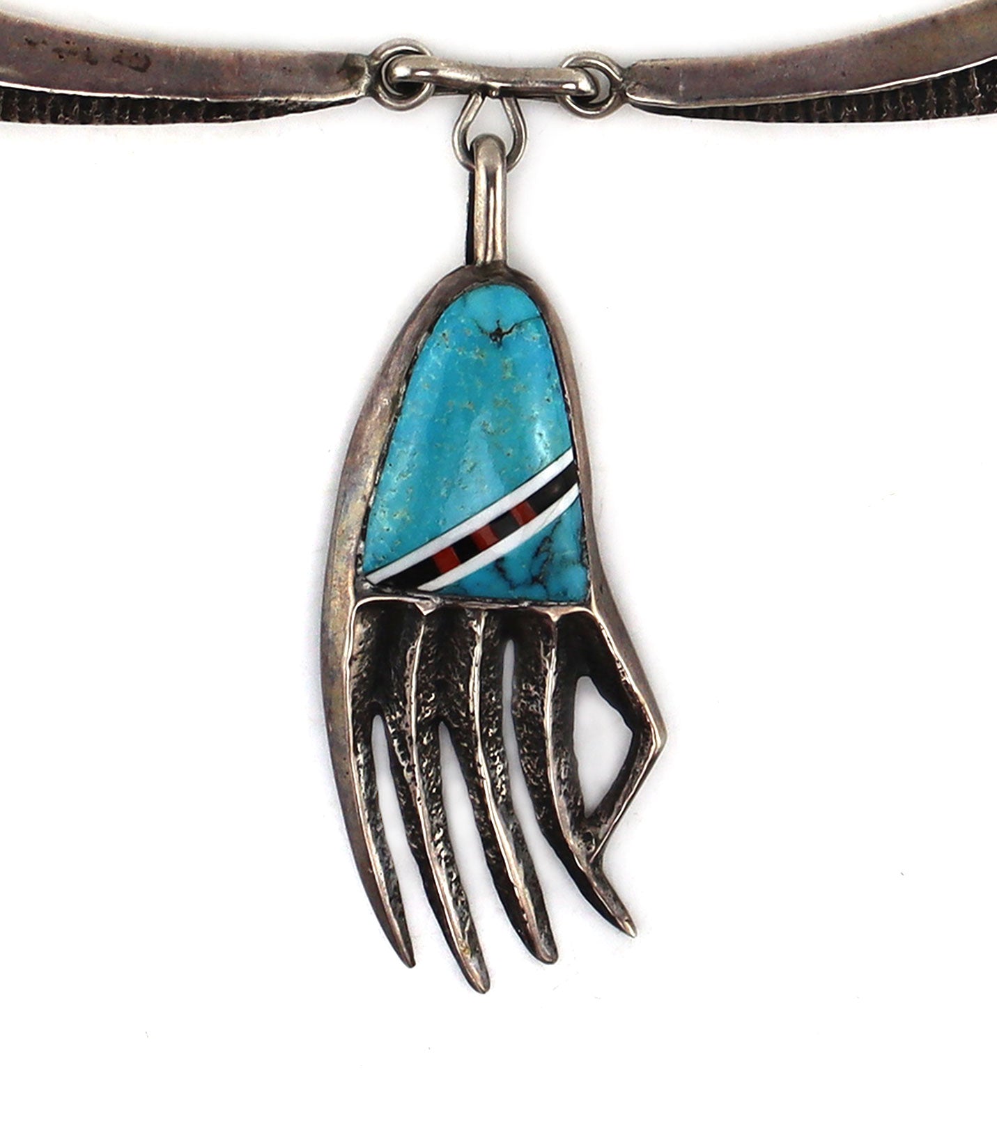Preston Monongye (1927-1987) - Hopi - Turquoise, Multi-Stone Inlay, and Silver Bear Claw Pendant/Choker Necklace c. 1970s, 2.5" x 1" pendant