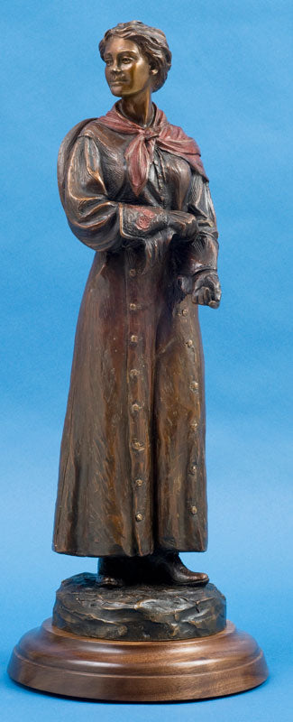 "Ready to Ride is patinaed with subtle variations of color. If you look at photos of my previous western women sculptures, it will help you visualize the patina. I do not "paint" the bronzes, but use variations of color to emphasize a change of material or texture. Note that I use the word "tinge" when describing colors.
