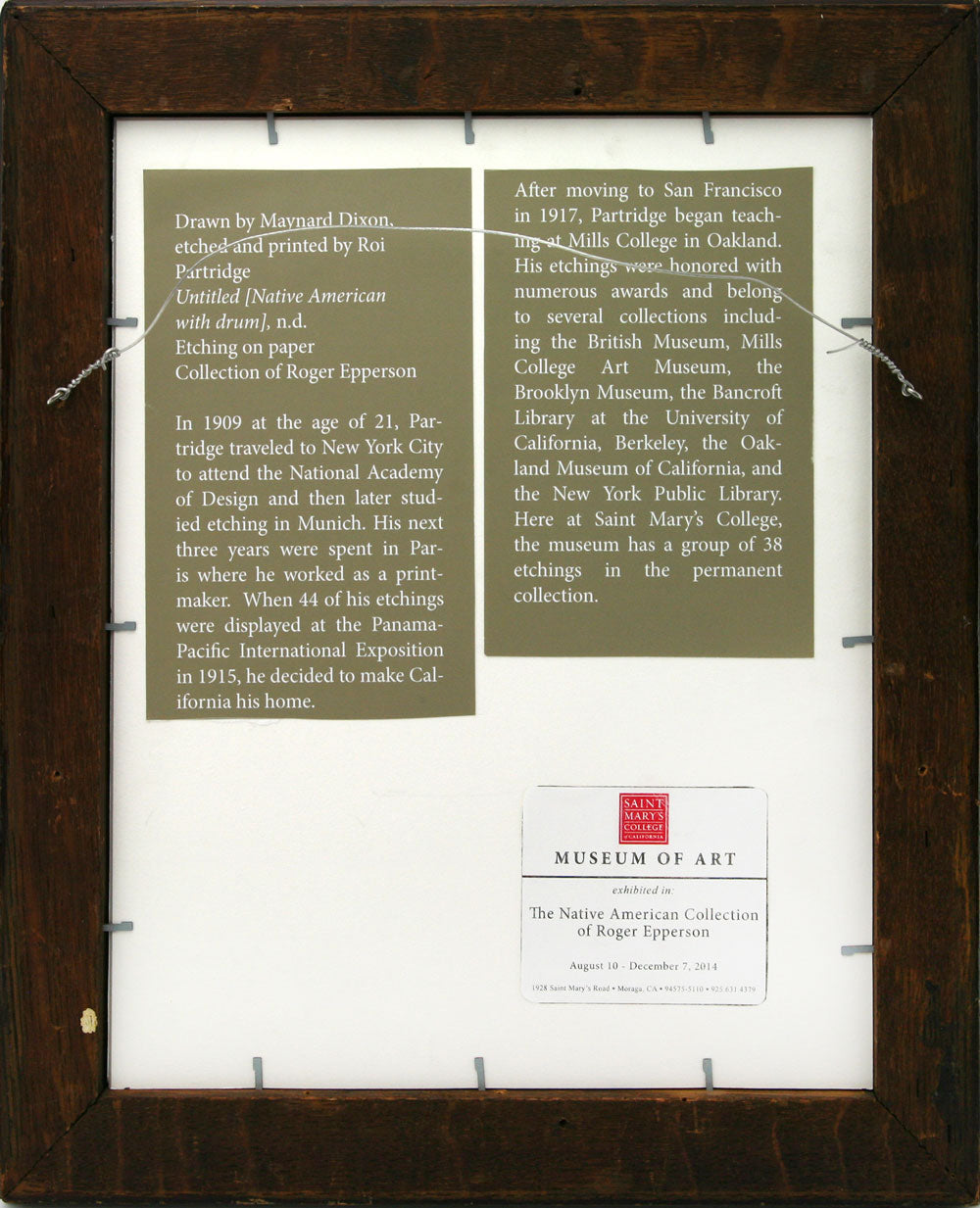 1920Dixon's only etching done in his lifetime of his work. Unframed Dimensions 6.75" x 4.5" Framed Dimensions 17.25" x 14.5" Printed Lower right Thunderbird Estate Stamp with 1920 date. Below image: "Drawn by Maynard Dixon, Etched and Printed by Roi Partridge." Acquired from a private collection out of California. On Verso Tag: Exhibited August 10-December 7, 2014 Saint Mary's College Museum of Art in " The Native American Collection of Roger Epperson." Published on pages 374-375, “Maynard Dixon’s American West”by Mark Sublette.