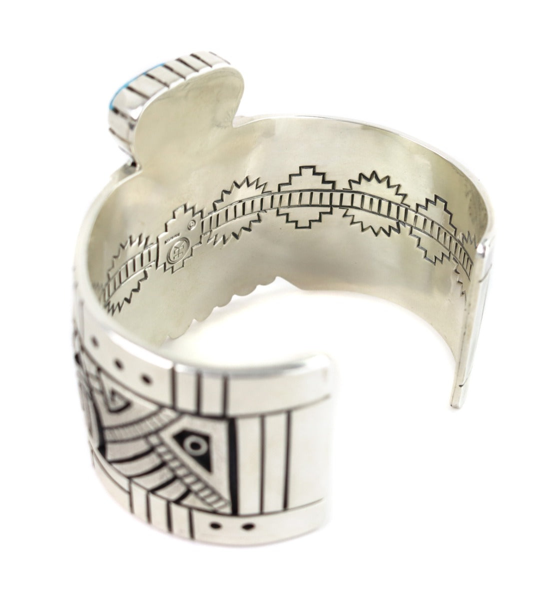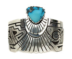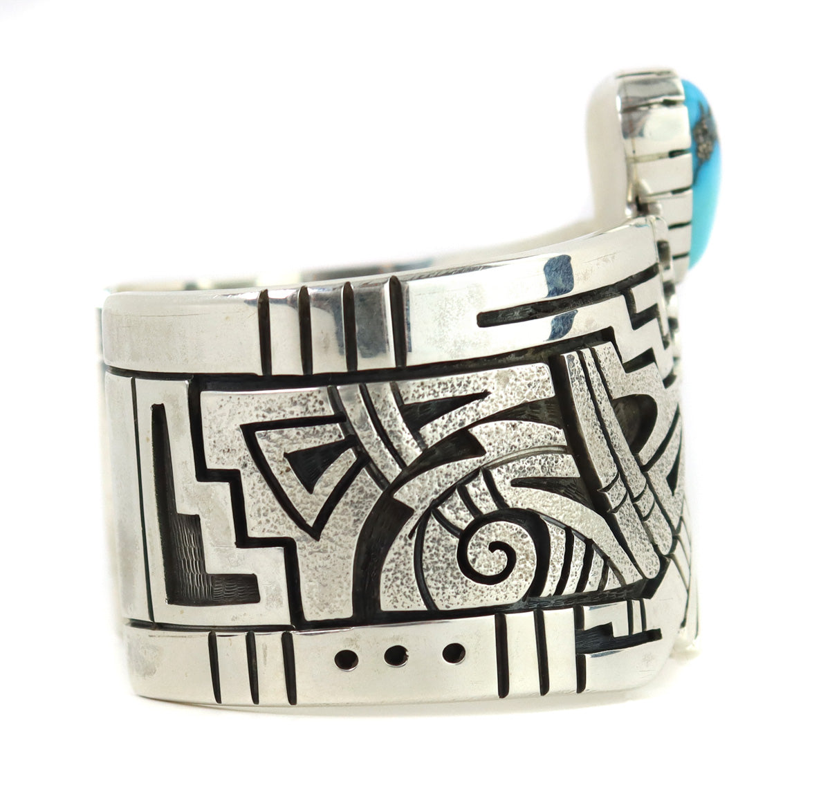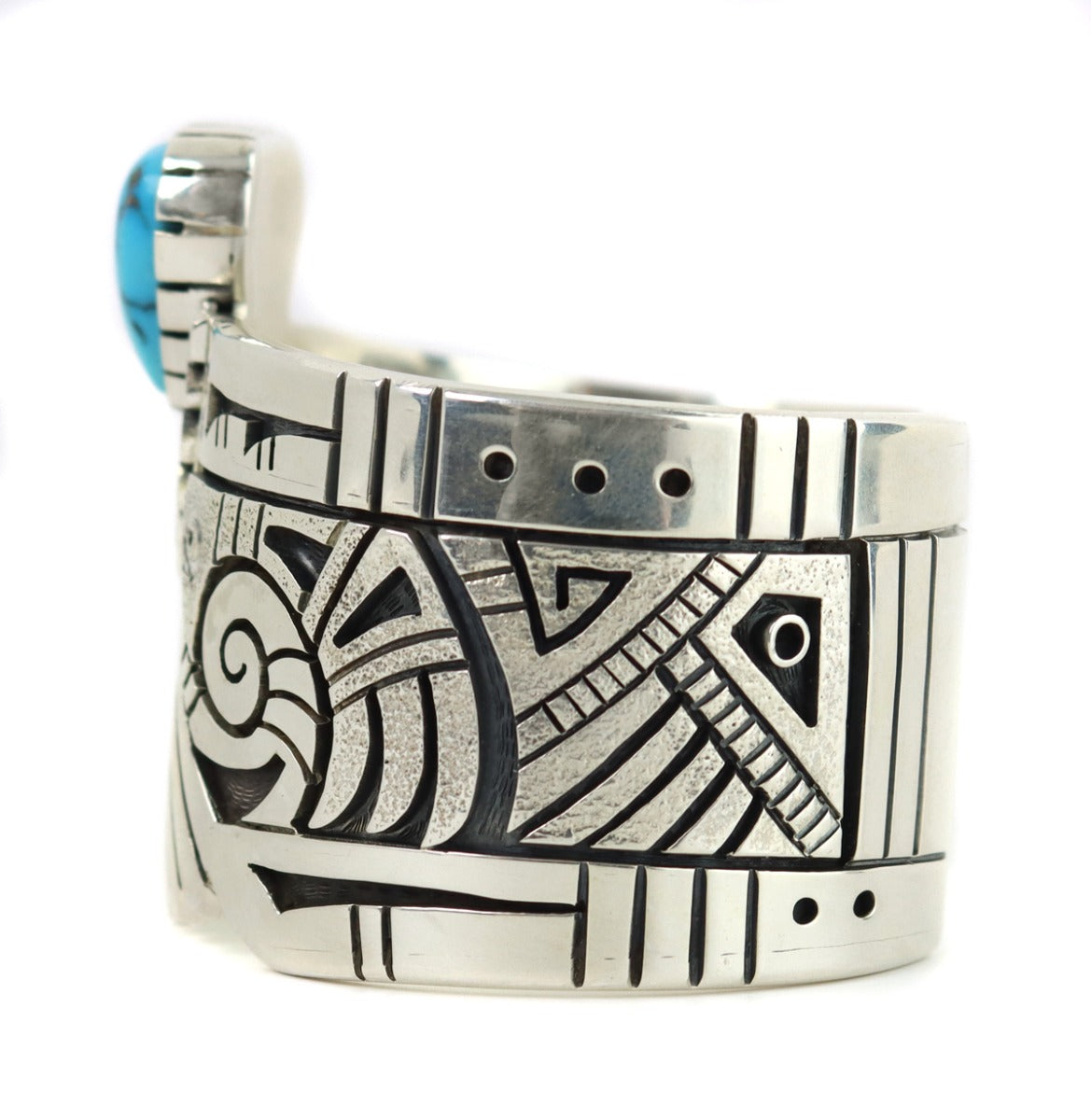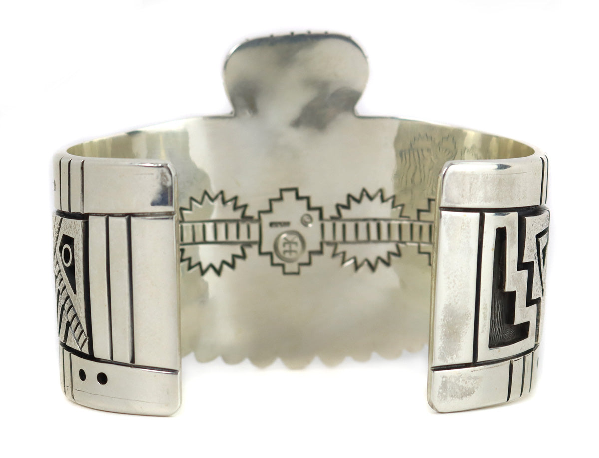 Roy Talahaftewa - "Ancestral Spirit" Hopi Contemporary Morenci Turquoise and Sterling Silver Overlay Bracelet, size 7 (J15136)