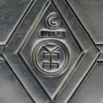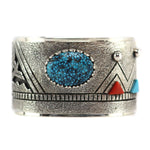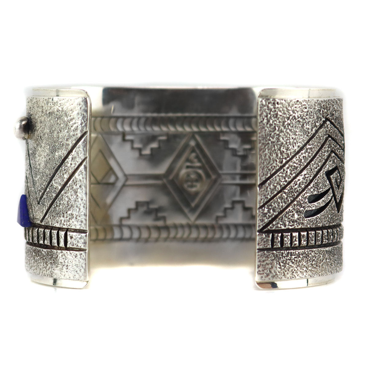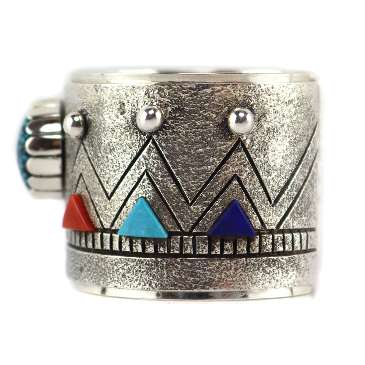 126.7g, 1.5" bandwidth, size 6.625 to include a 1.25" gap. Stones include: turquoise, coral, and lapis lazuli. Artist hallmark on verso.