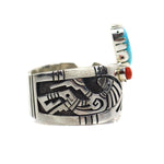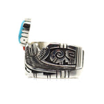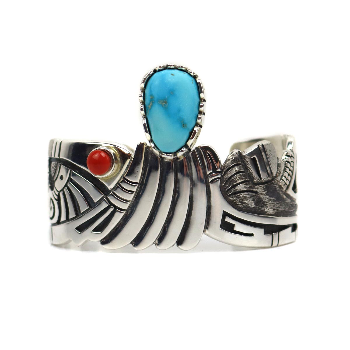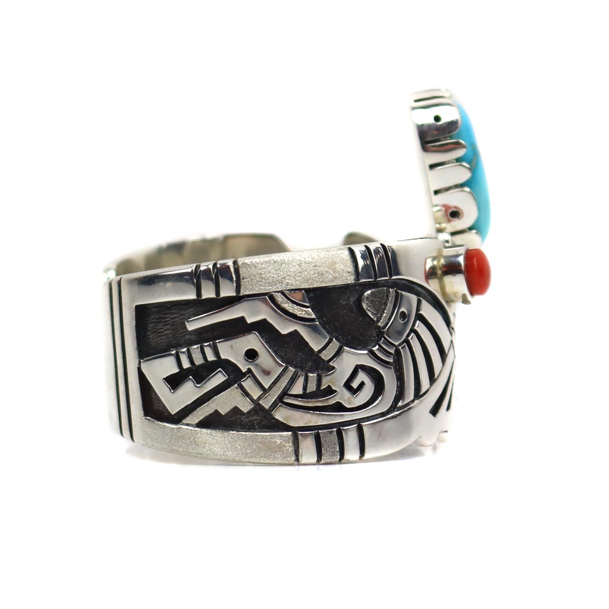 Roy Talahaftewa - Hopi Contemporary Morenci Turquoise, Coral, and Sterling Silver Overlay Bracelet, size 6.75 (J15270)