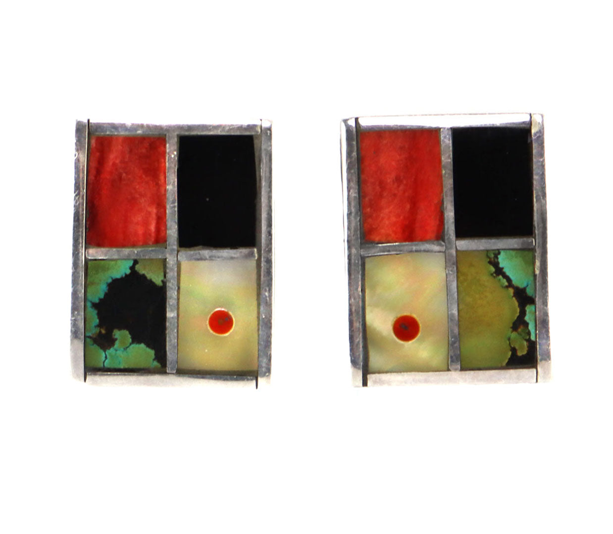 17.2g, 1.5" x 1.125" per earring. Stones include turquoise, mother of pearl, spiny oyster, coral, and jet. Ex Arizona collection.