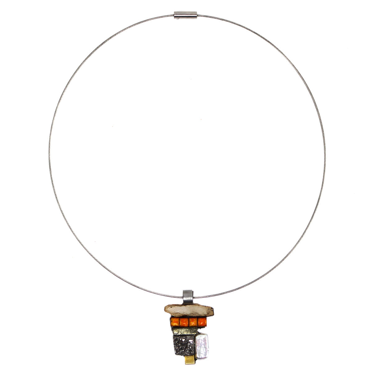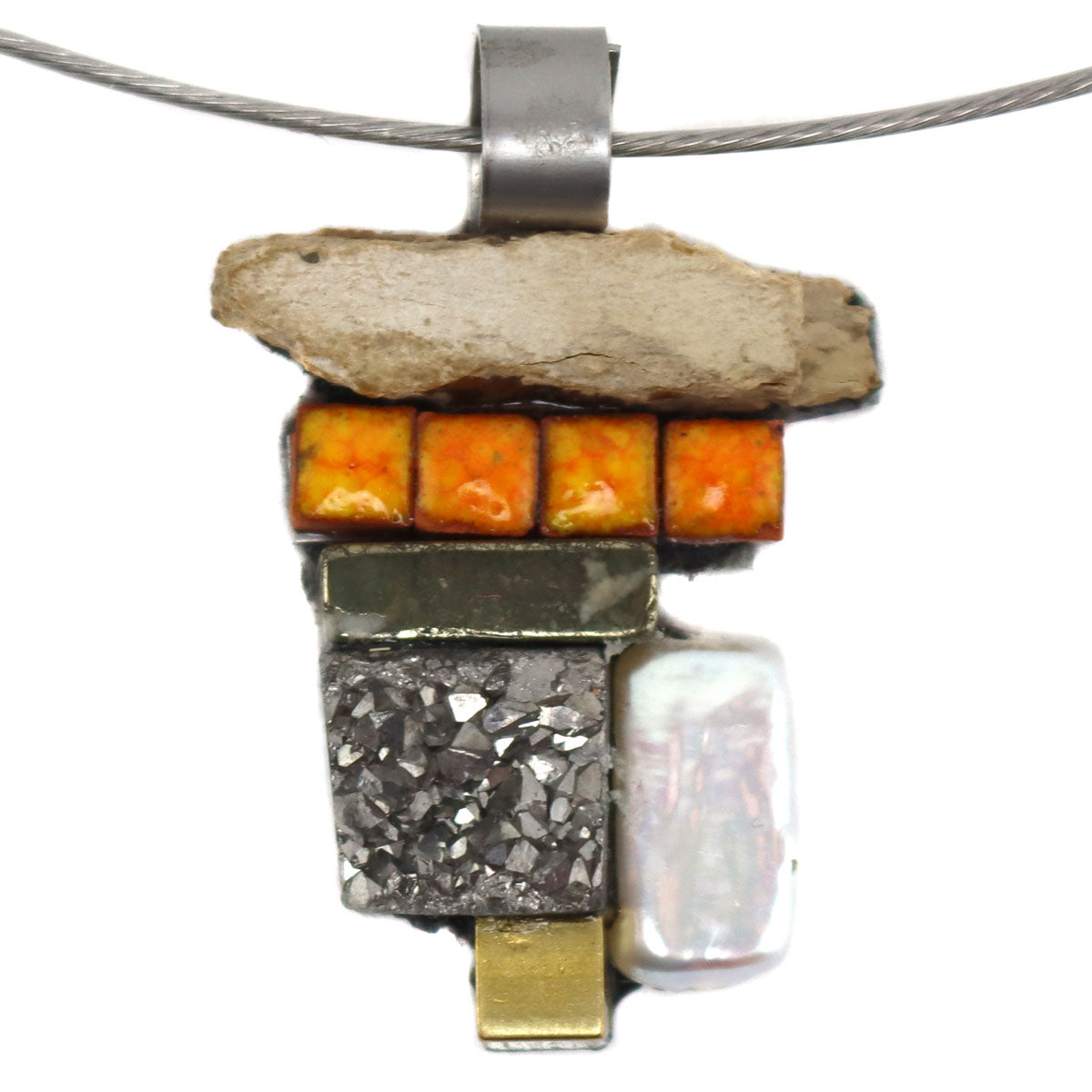 Shirley Wagner - Contemporary "Ancient Layers" Pendant with Bone, Pyrite, Tile, and Freshwater Pearl, 1.625" x 1" pendant