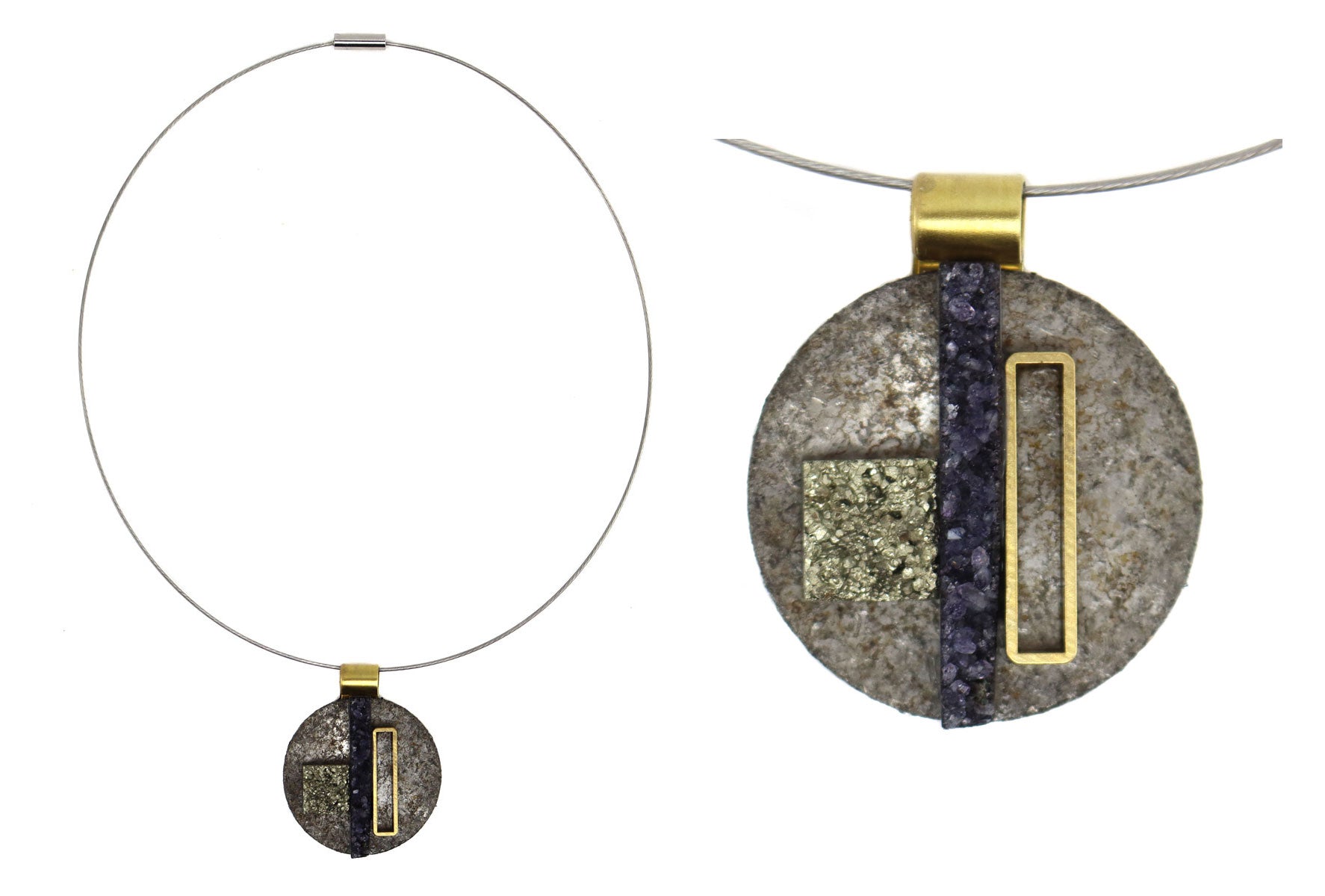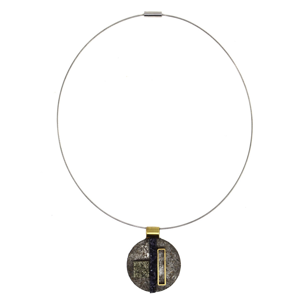 Shirley Wagner - Contemporary "Glorious" Pendant with Steel, Amethyst Geode, Pyrite, and Brass 1.875" x 1.5"