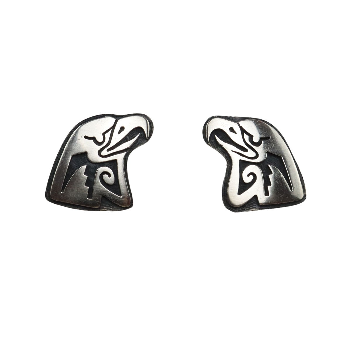 Sidney Sahneyah - Hopi Sterling Silver Overlay Post Earrings with Eagle Design c. 1990s, 0.75" x 1" (J13998-078)