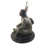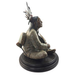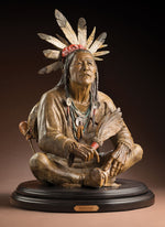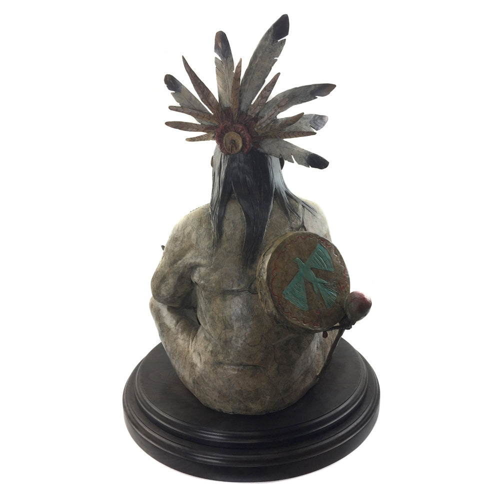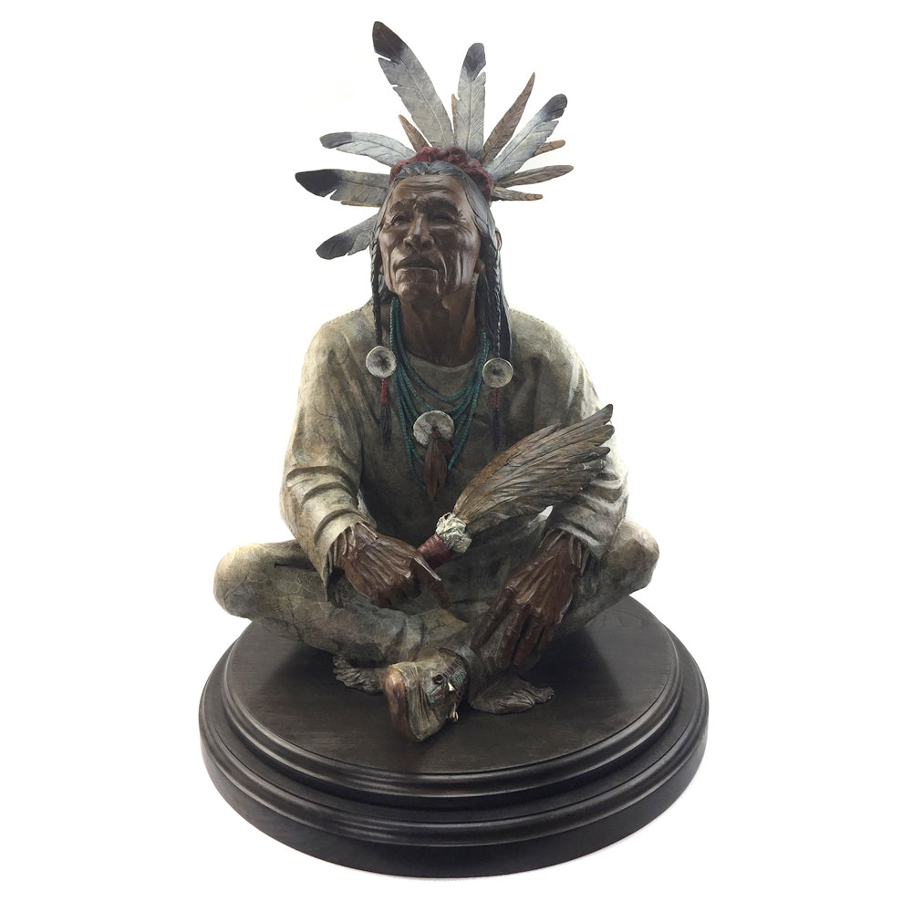 Winner of the 2017 Wieghorst Best in Show Award, Mountain Oyster Club. Artist comments: - "I decided to create a shaman based on what I am most familiar... a Native American from my own continent. The Oglala Sioux medicine men were subjects of several historical books about Black Elk and Crazy Horse that influenced me many decades ago. This seemed like the right time to bring out my thoughts and feelings about these significant "seers" and "wisdom keepers" in my sculpture. He is in a prayer chant, using intonations, drumming, and wafting the smoke of burning sage over himself using his eagle prayer fan in order to reach the state of consciousness that puts him in touch with divine spirits. In this altered state, he can appeal to spirit helpers and divine powers for aid in facing troubled times." - Star Liana York.