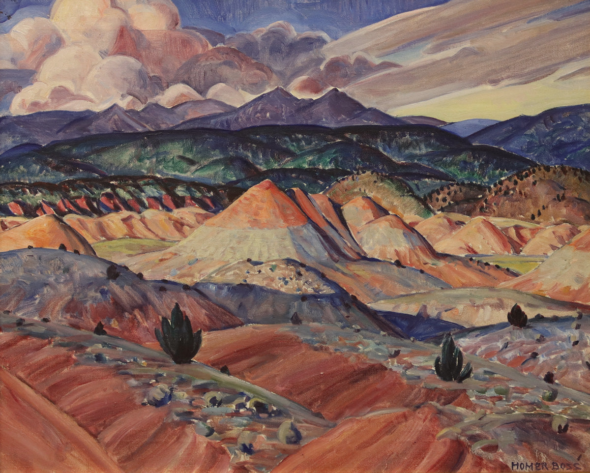 26.75" x 30.5" framed. Very good condition. Acquired from a private collection in Missouri. According to the Boss Family, this piece was given to a niece of Homer. In the artist's catalogue, the painting has the following description: Near Chimayo, $700, oil, 20 x 25, Conical hill center of canvas--pink top--grey base. Stormy sky behind violet mts. Rich greenish foothills. R.V. foreground--deep erosion.