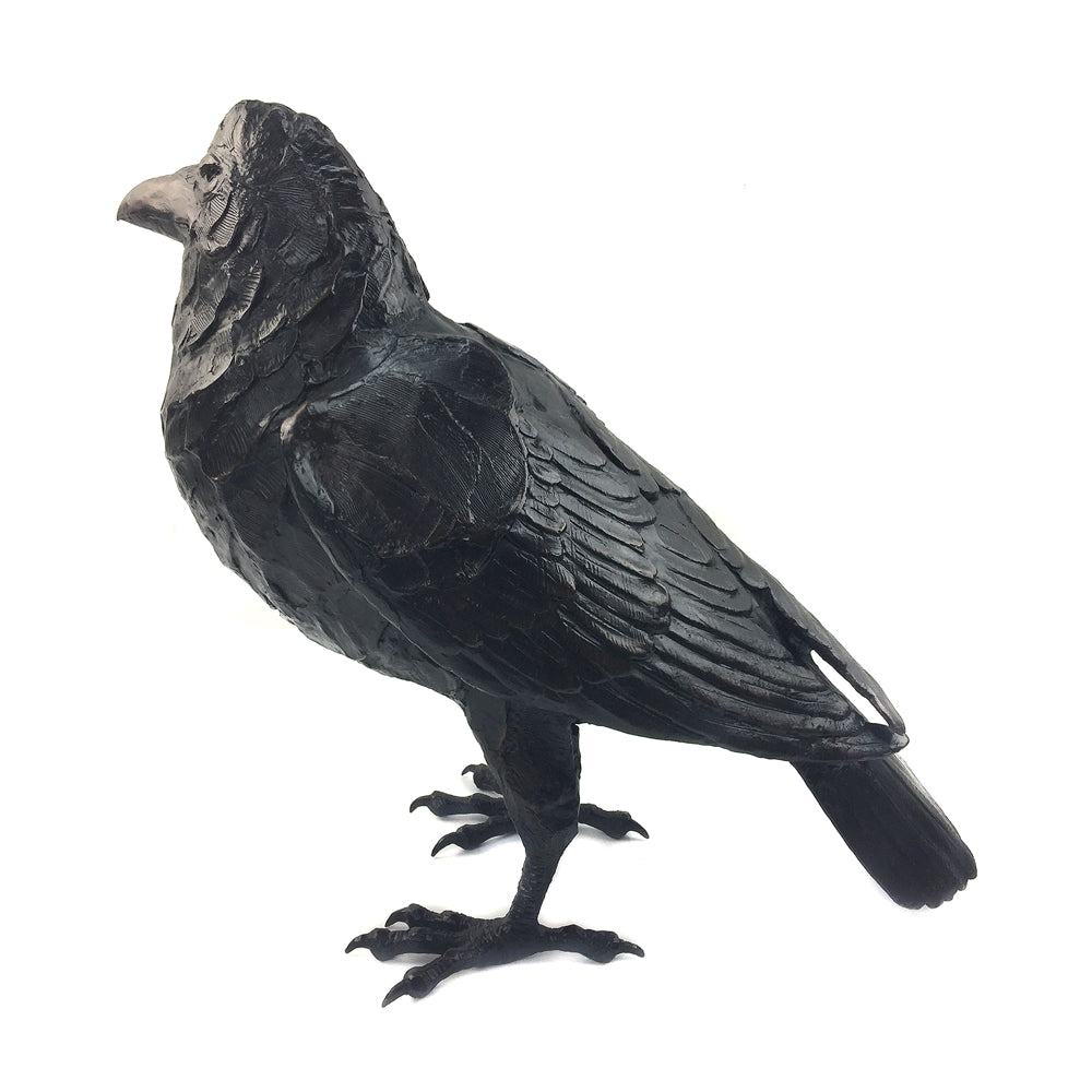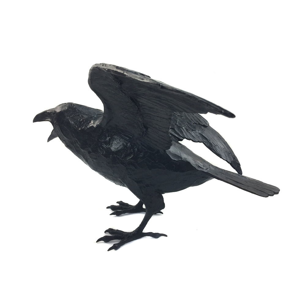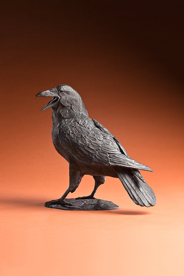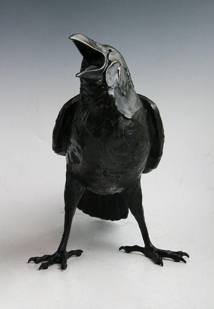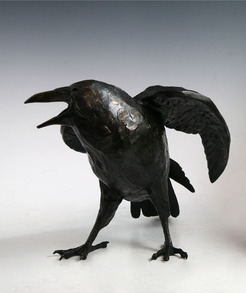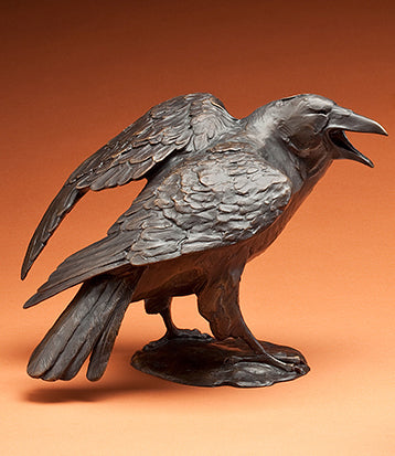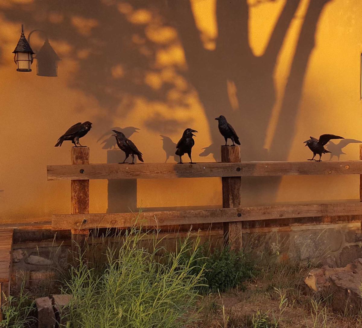 "'Raven' is defined in the dictionary as talk intended to charm or beguile, and idle chatter. These Ravens often visit the huge cottonwood outside my studio and begin an amazing array of vocalizations... chattering away until I come out to interact with them. They sometimes will perch on the telephone poles at the entrance to our ranch, and when I go out to ride will chatter as if they wish me to acknowledge their presence. Sometimes they will fly along with us on the ride... behavior which I find charming and beguiling indeed! At our ranch, we have noted that every year, the ravens begin to appear in a large flock. We have ravens around all year, but in early summer they come in droves and seem to have rather raucous meetings regularly, hanging out on our board fences for their palaver sessions." - Star Liana York