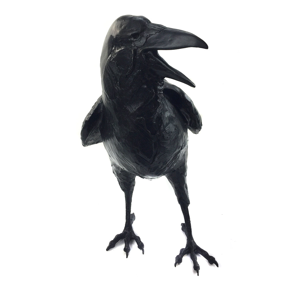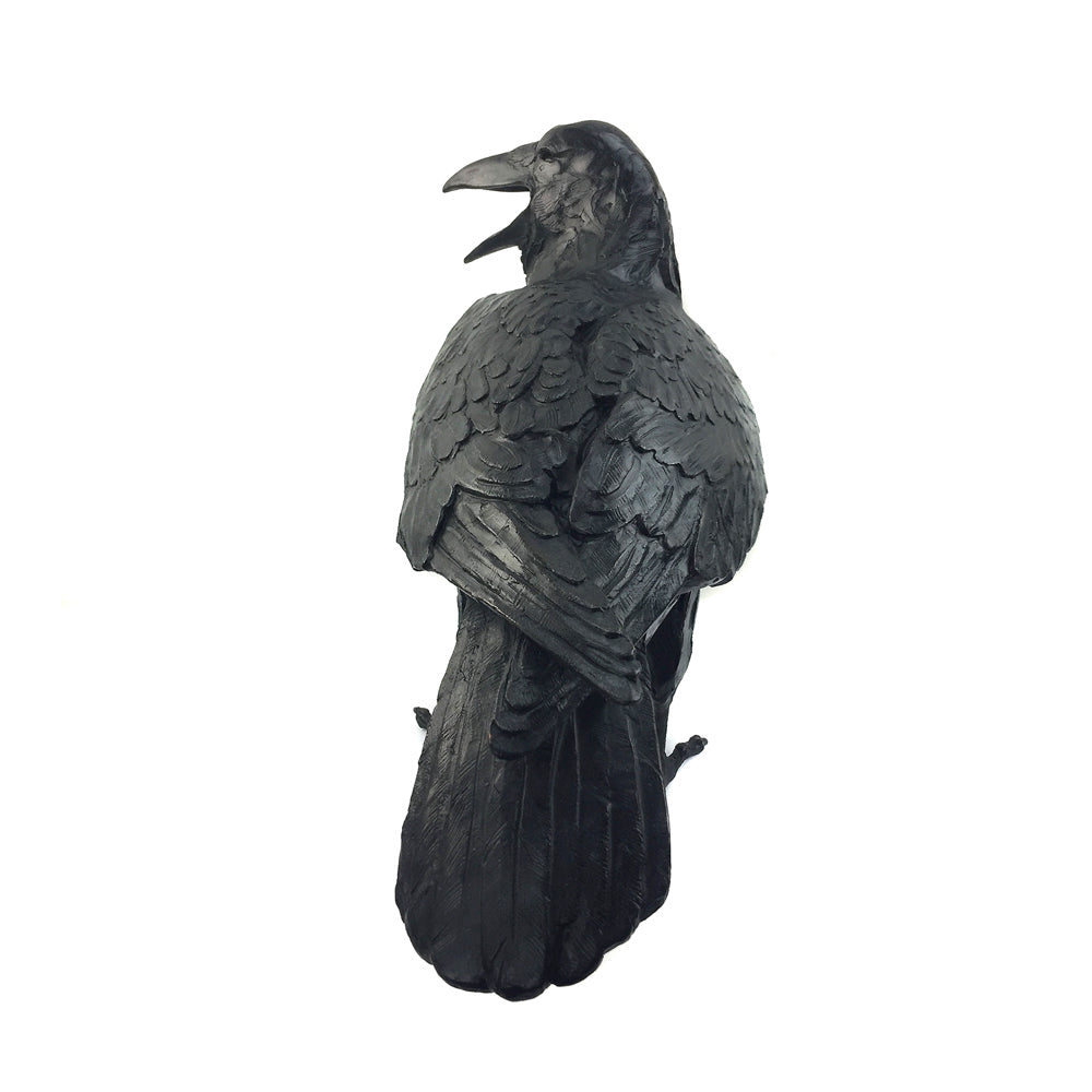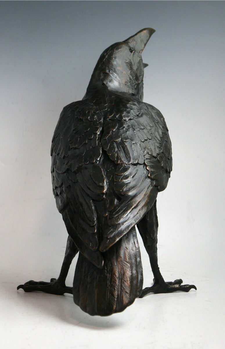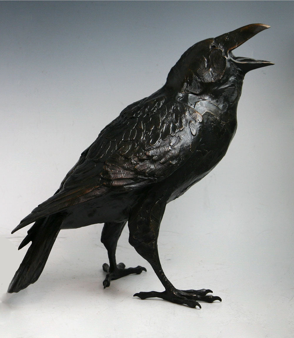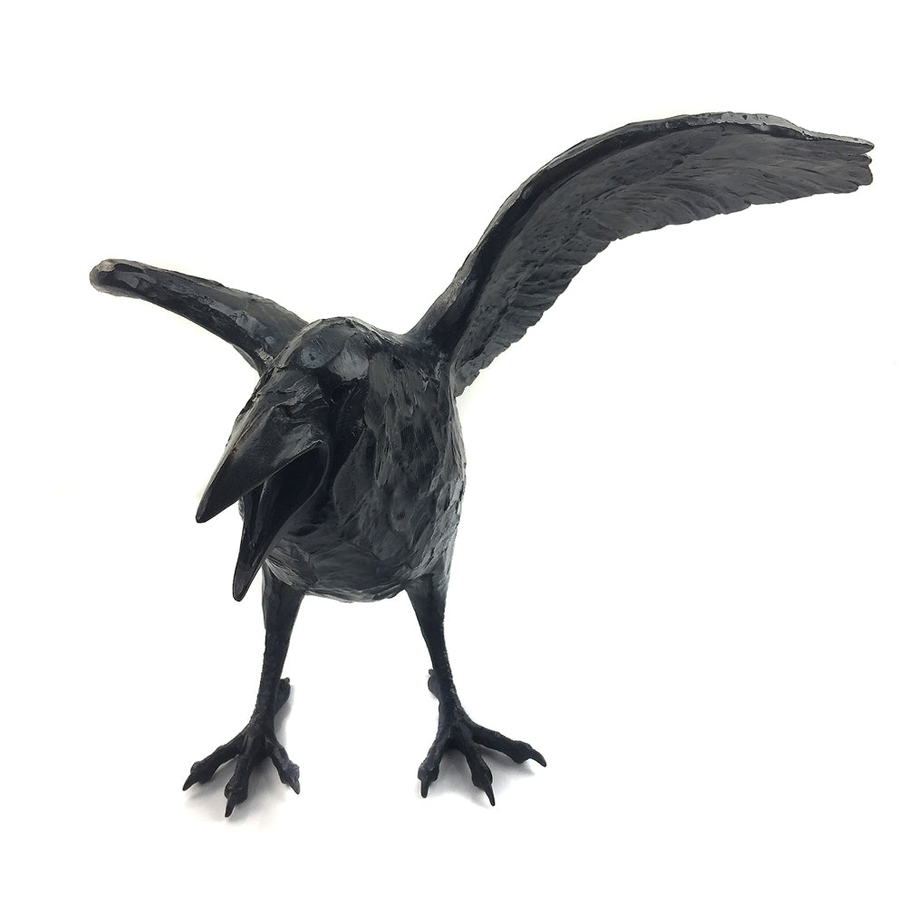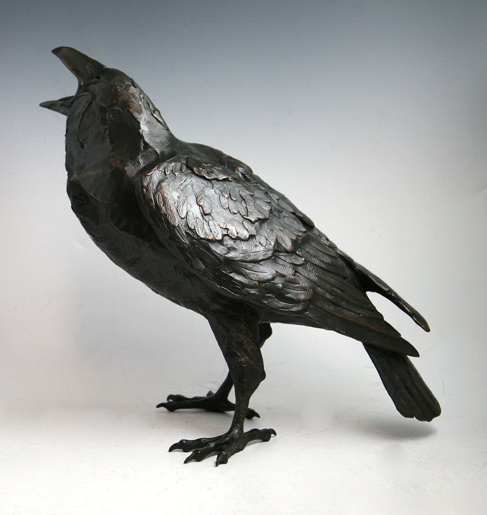 "'Raven' is defined in the dictionary as talk intended to charm or beguile, and idle chatter. These Ravens often visit the huge cottonwood outside my studio and begin an amazing array of vocalizations... chattering away until I come out to interact with them. They sometimes will perch on the telephone poles at the entrance to our ranch, and when I go out to ride will chatter as if they wish me to acknowledge their presence. Sometimes they will fly along with us on the ride... behavior which I find charming and beguiling indeed! At our ranch, we have noted that every year, the ravens begin to appear in a large flock. We have ravens around all year, but in early summer they come in droves and seem to have rather raucous meetings regularly, hanging out on our board fences for their palaver sessions." - Star Liana York