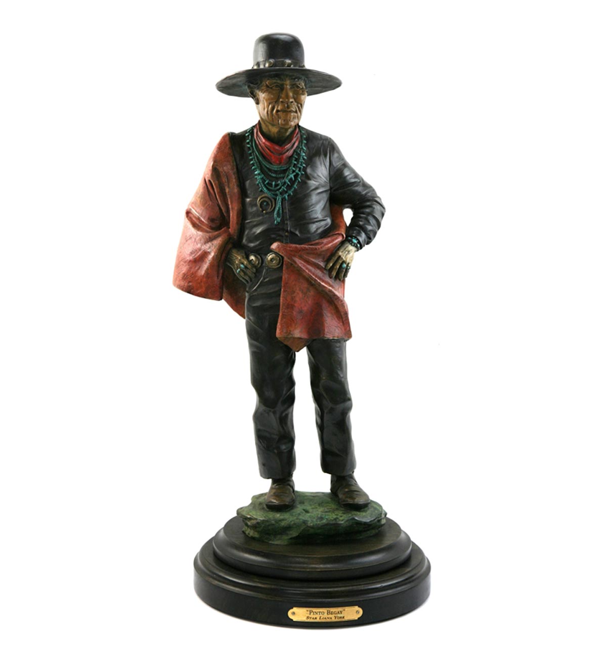 "There is more to sculpting Native faces than high cheekbones," Star has said. "To do it successfully, you must create a sense of inner character. The piece must have an expression that reflects the way that person thinks of himself, and his place in the universe." Star's sculpture 'Pinto Begay' is a good illustration of this approach. He is a Navajo medicine man bedecked in jewelry he has received in payment for his healing talents. But his posture and stance, with a hint of swagger, remind us that stature has little to do with size. And his gaze radiates the confidence of someone in possession of extraordinary powers.