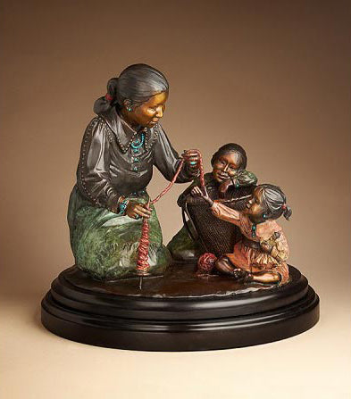 15″"Part of the process of turning wool into weave-able yarn is drawing out the “carded” wool after shearing the sheep into thinner, finer thread. It requires pulling the wool thru fingers with a twirling motion as it is wound onto a spindle. Nizhoni has become a young mother who teaches her own daughters by example as her mother showed her and her mother did her, going back generations. Before weaving into intricate patterns, the yarn may be dyed with natural pigments. These patterns are developed from a sense of aesthetic influenced by the dramatic beauty of the surrounding desert environment. The symbols used also reflect their beliefs & myths. Often the design may tell a story of either the tribe or family history that also incorporates their cultural values. So, not only does this mother pass along the skill of creating yarn and weaving fabric, but also she teaches the symbology of their culture." - Star Liana York