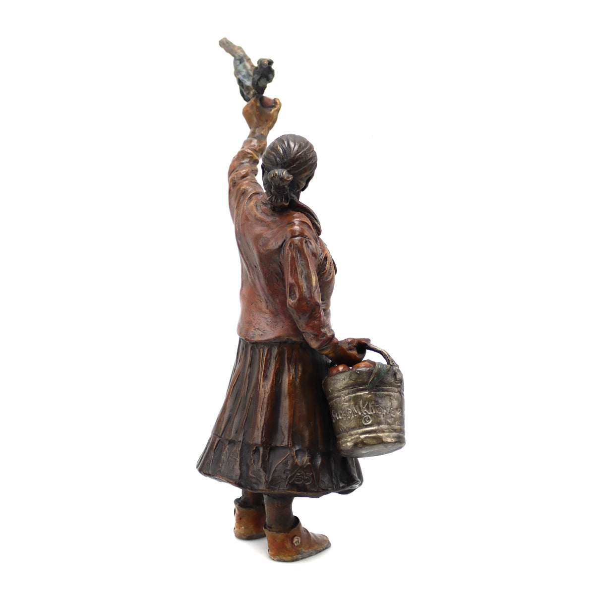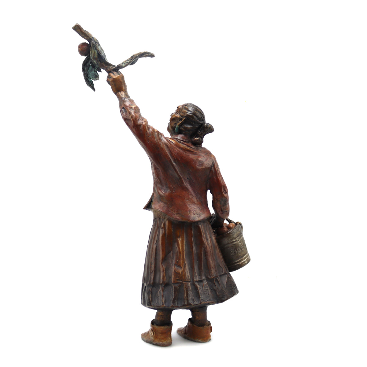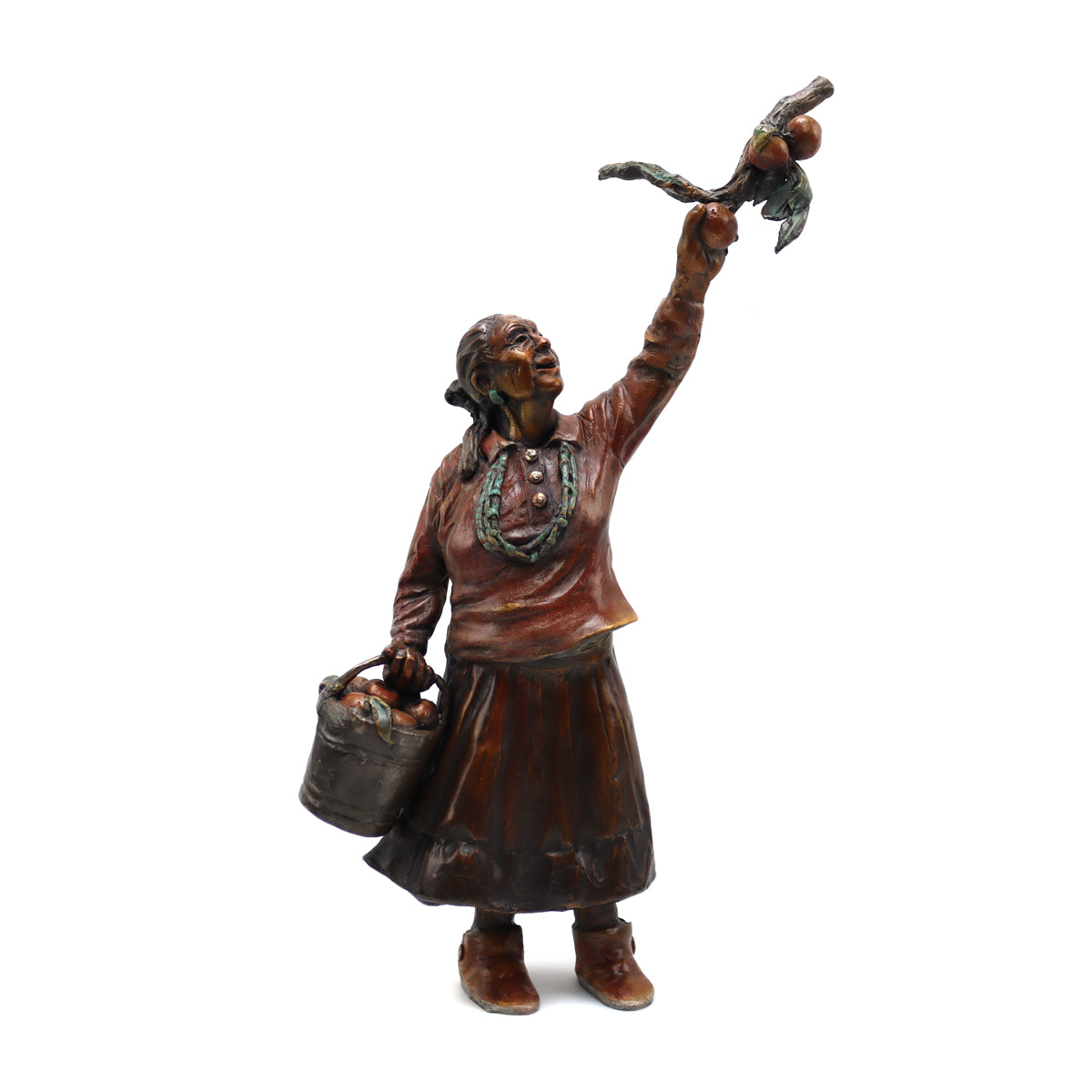 13″Susan Kliewer's historic series "Early Days on Navajoland" depicting Navajo (Dinà) life from the late 1800s. This expressive, kindly grandmother is reaching up and picking peaches from their abundant orchards. The inspiration for this dynamic bronze comes from the oral tradition of Navajo elders, as they shared with Susan the joy of picking apples and peaches in Canyon de Chelly (before their removal). Keeping warm and positive memories, throughout all manner of hardship, is a noble and beautiful way of being!
