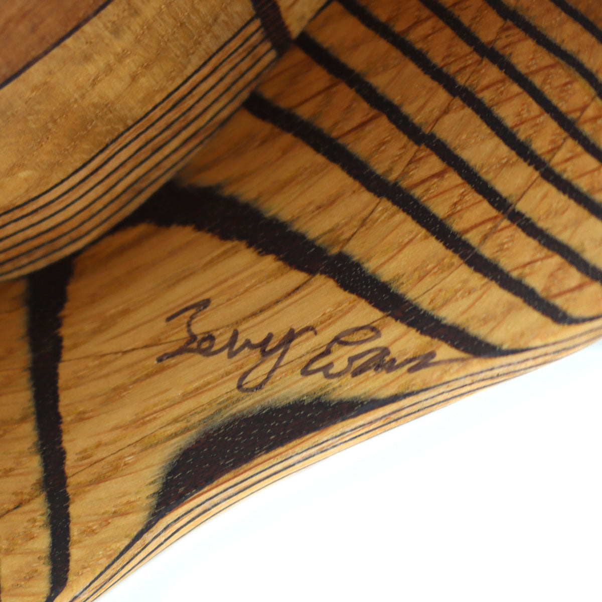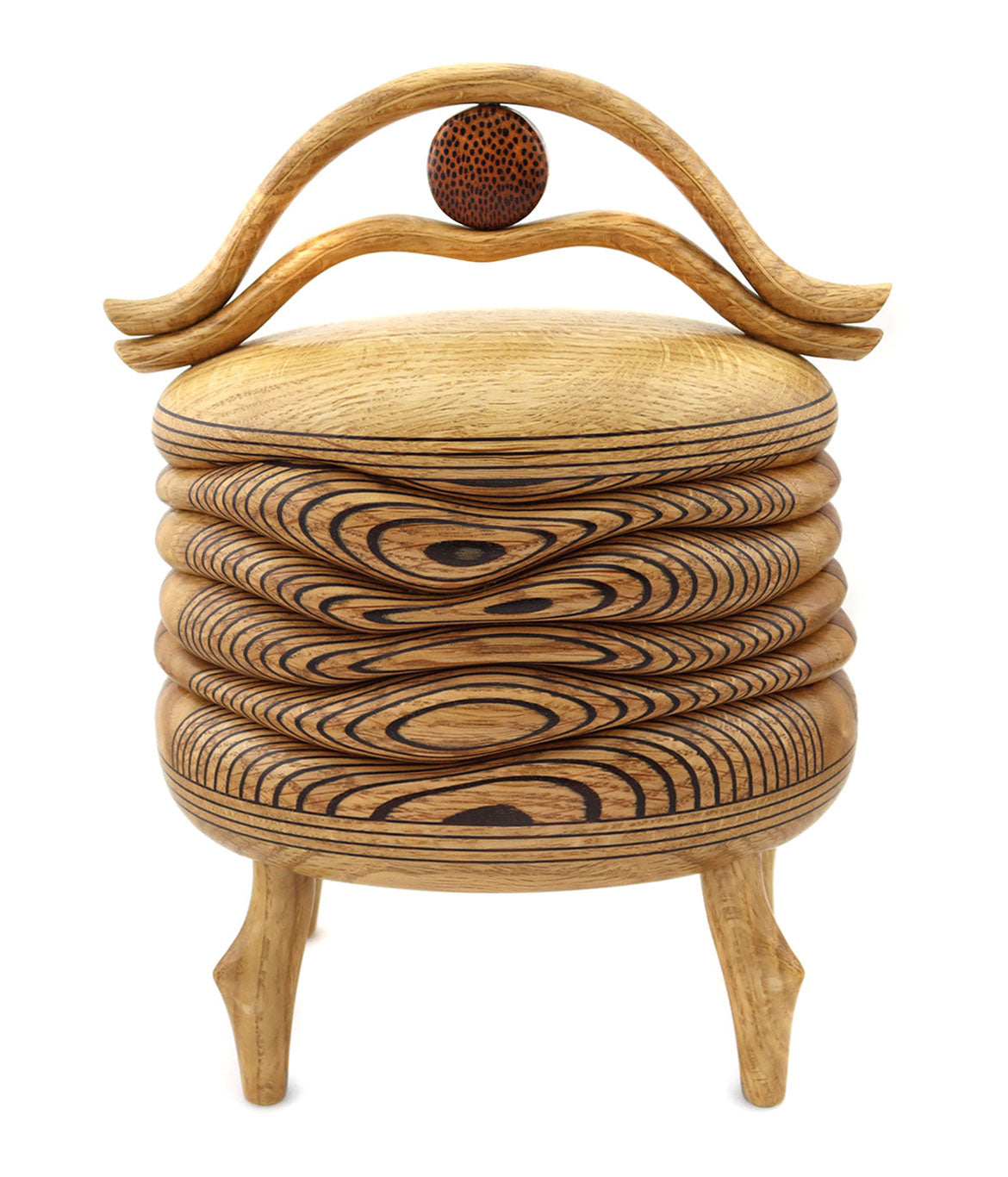 White oak with white oak veneer and fumed etimoe veneer. Bead is red palm.
