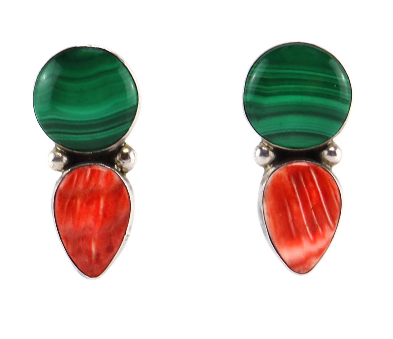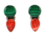 Tommy Jackson (b. 1958) - Navajo - Spiny Oyster, Malachite, and Silver Clip-On Earrings c. 1980-90s, 1.75" x 0.875"