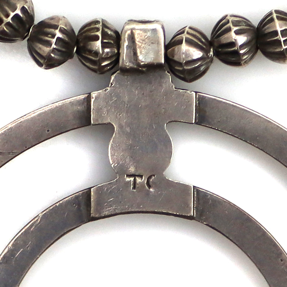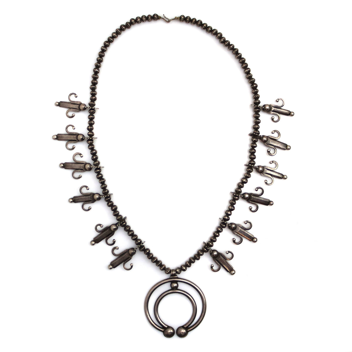 Tommy Singer (1940-2014) Navajo and Joseph Quintana (1915-1991) Cochiti - Silver Beaded Squash Blossom Necklace with Corn Design c. 1960s, 25" length