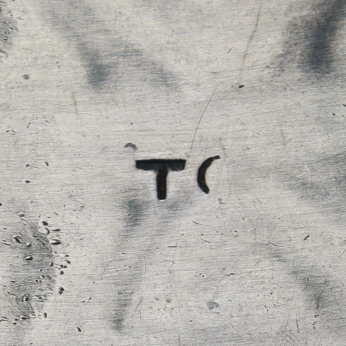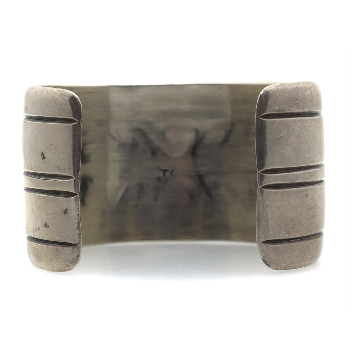 63.6g, 1.5" bandwidth, size 6.75 to include a gap of 1.25". Hallmarked "T" a quarter moon pictorial on verso. Acquired from a private collection in Arizona. The owner inherited this item from her cousin, who was a successful public relations marketer in Phoenix, Arizona. The owner believes that this item was gifted to her cousin from Guy Stillman of McCormick Railroad Park, in Scottsdale, Arizona. Tommy Singer is the Navajo jeweler who is credited as the originator of the chip inlay design which he developed in the 1970s. He combines inlayed turquoise, coral, and Silver with traditional Navajo designs to create his unique style. He was taught silver smithing from his father when he was 7 and quickly became proficient in in stamped and overlay designs before pioneering chip inlay designs.