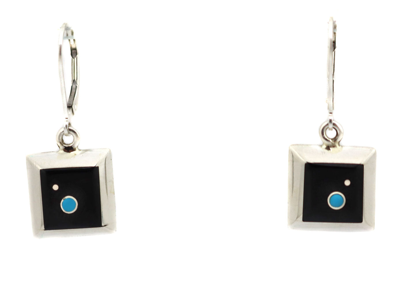 Veronica Benally - Navajo - Contemporary Jet and Turquoise Inlay and Sterling Silver Hook Earrings, 1.25" x 0.5"