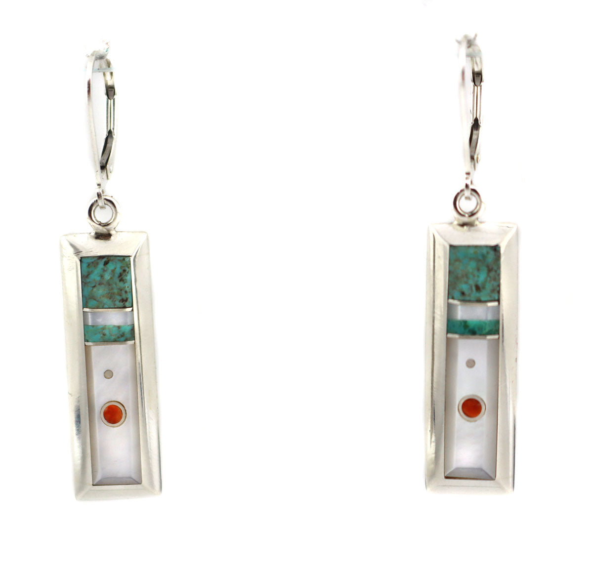 3.7g, 1.875" x 0.375" per earring. Stones include: mother of pearl, turquoise, and spiny oyster. Artist hallmark on verso.