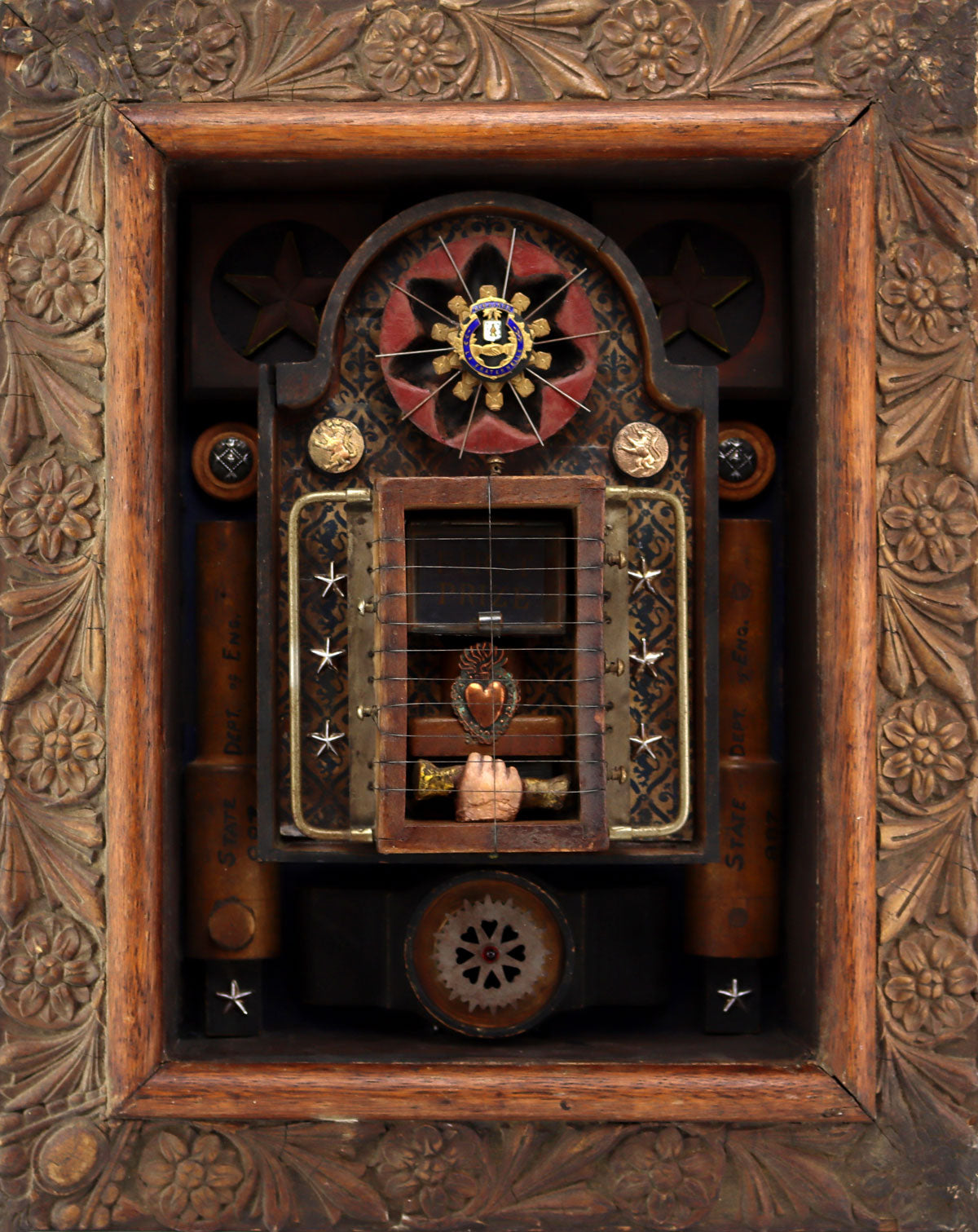20" x 16" x 4". "Homage to the triumph of love. Parts assembled: antique butter cutter, engineering molds, copper sacred heart, jello mold, a model hand with a scroll from a Santo, metal gear, buttons, antique first prize ribbon, French fraternal medal, antique wallpaper, tin nicho with glass door, etc." - Victoria Roberts