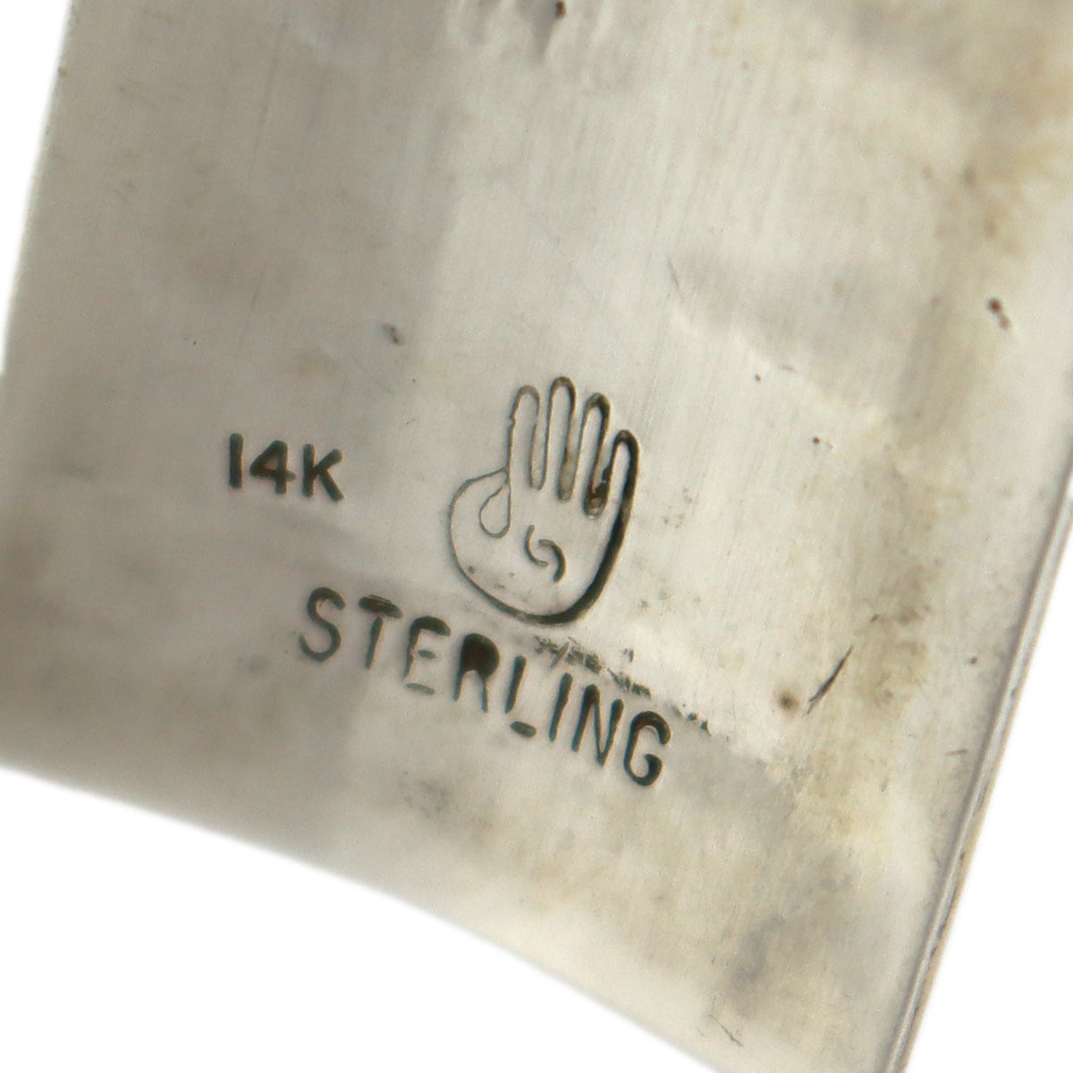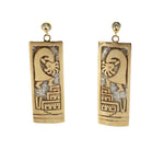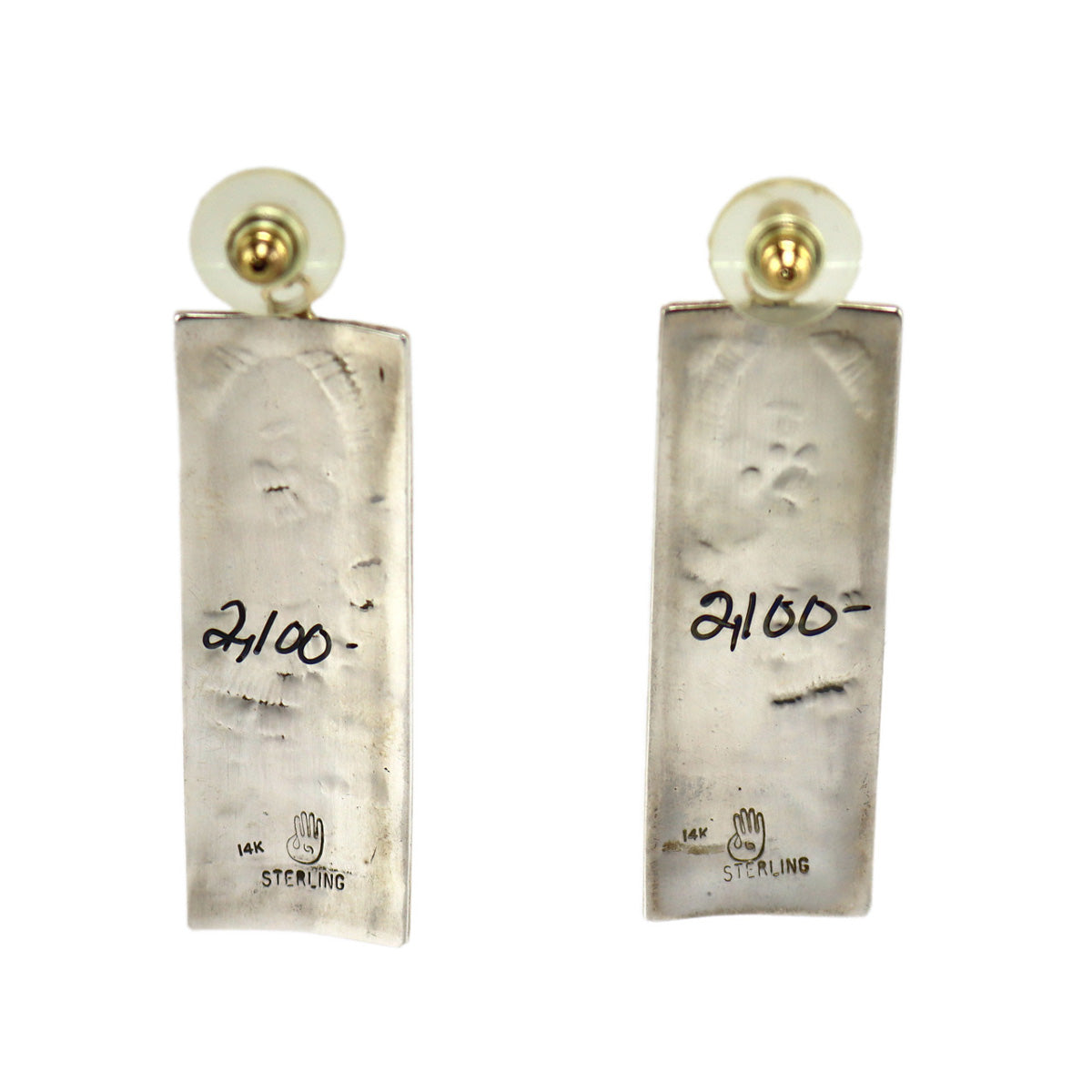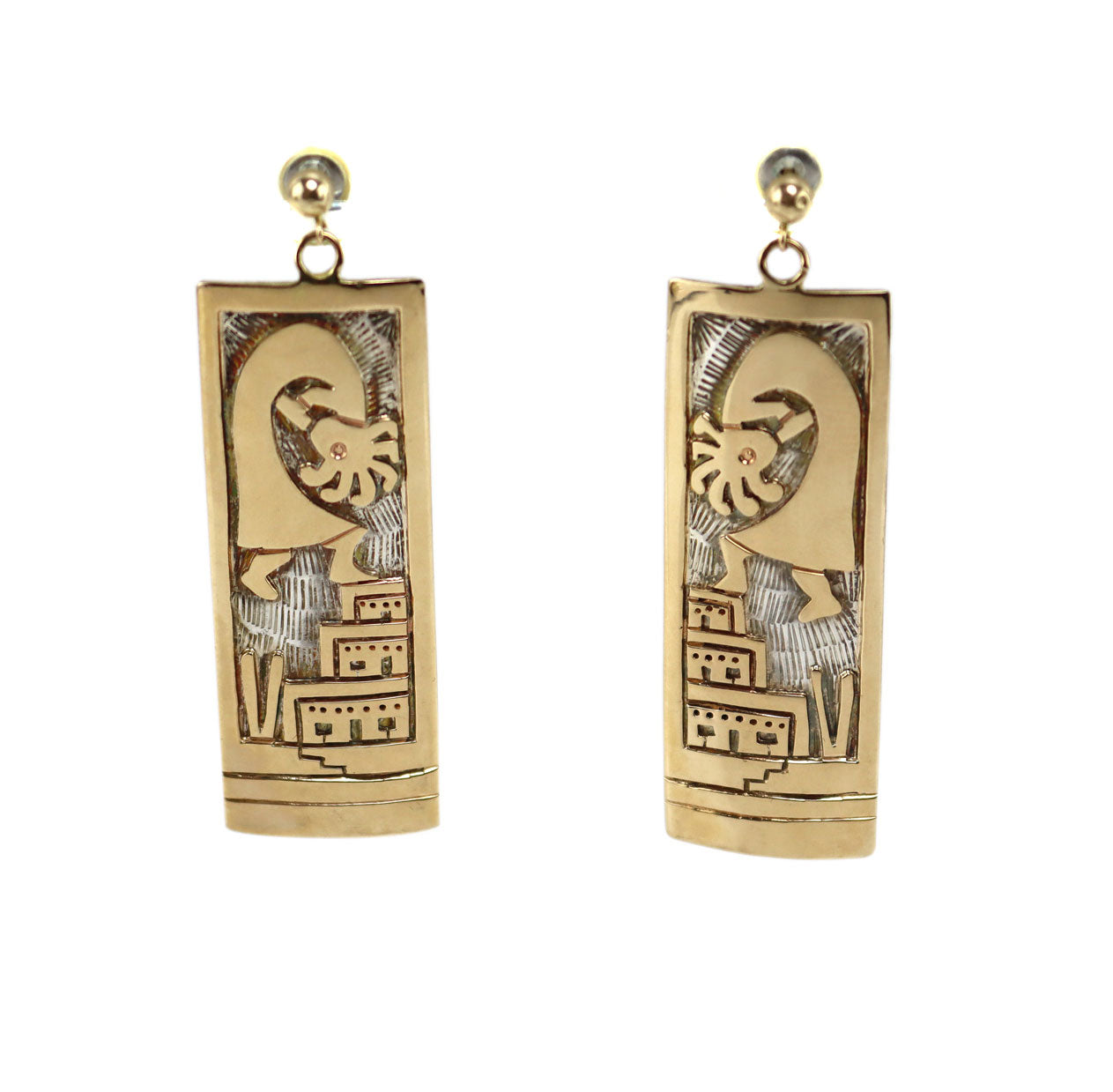 Watson Honanie (b. 1953) - Hopi - 14K Gold and Sterling Silver Overlay Post Earrings with Kokopelli and Pueblo Pictorial c. 1980s, 2.375' x 0.75"