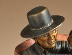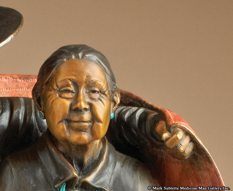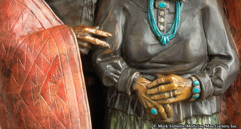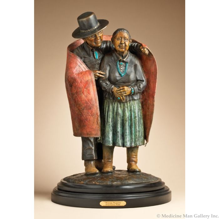 "Fabric of Life" Suite. The suite consits of four sculptures that reflect the four seasons: Spring, Summer, Fall and Winter. Each represents a stage in the creation of a wool weaving, from the raising of the sheep to the blanket's use. Interwoven is the life of a Navajo woman - as a child, mother, grandmother and finally elder. I will call her Nizhoni. "Winter Warmth" Nizhoni and her husband have reached elder status, and together they walk through the golden years of their full lives. He wraps the beloved blanket over her, the weaving she finished with such pride so many years ago. In their faces are the lines that tell the story of lives well lived. Despite hardships, their lives are a tapestry of love and laughter, and they now face their last years with peace and contentment. The weaving warms them, shelters them, and connects them - a work of art from her heart and hands, an integral part of who they are and the life they've shared.