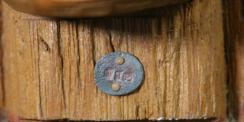 Acquired from the son of Thelma Finley Smith. Thelma and Jim Pugh had a shop in Venice, California and were famous for their carvings of Spanish ships in the late 1950s and 1960s. They signed their carvings with "TJP." One the front of the sculpture is a brass plaque with these initials, and they also carved the initials in the wood on the back. The owner has authorized us to lower the price from $650 to $335. This is a wonderful collecting opportunity.