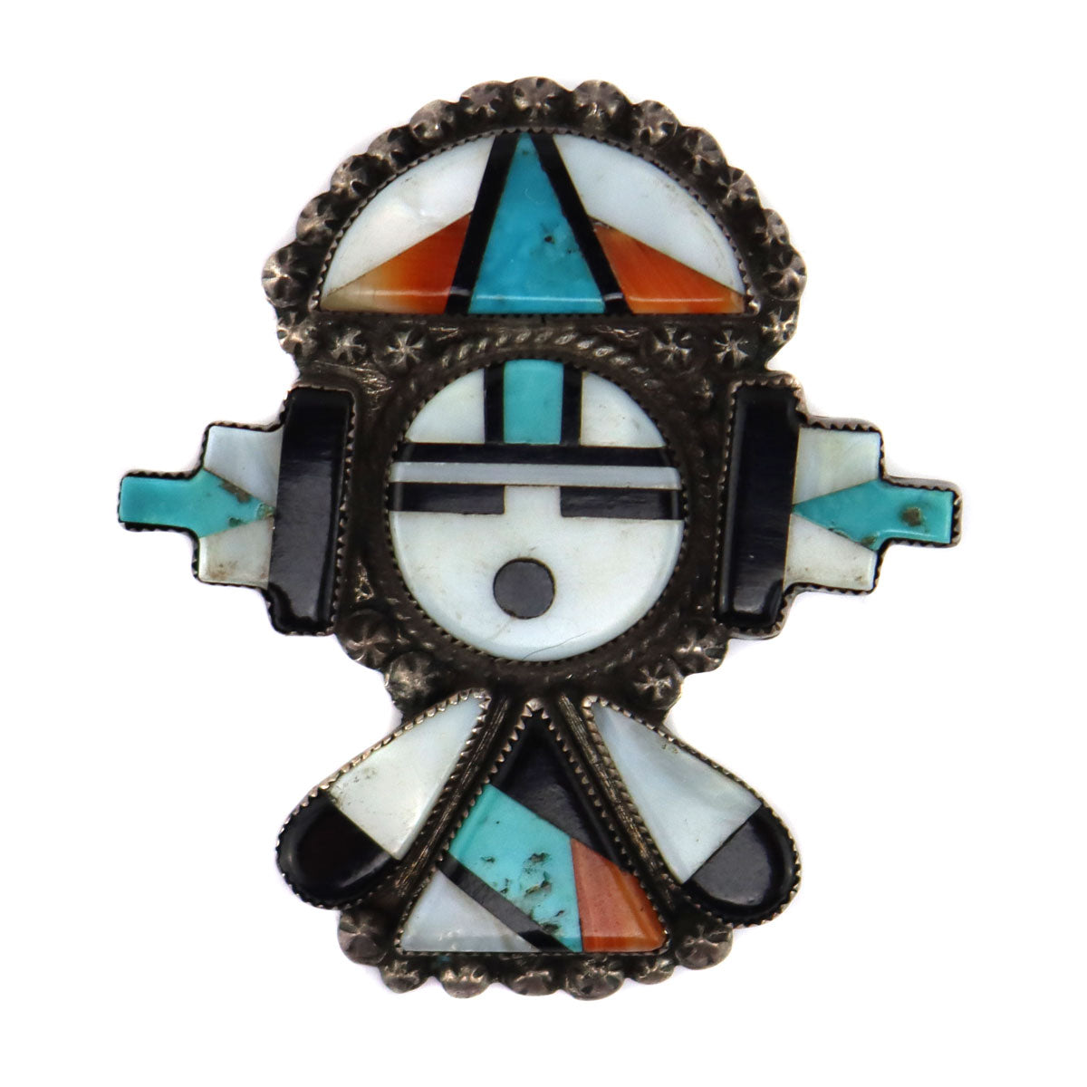 Zuni - Multi-Stone Inlay and Silver Pin with Sunface Kachina Design c. 1940s, 1.75" x 1.625"